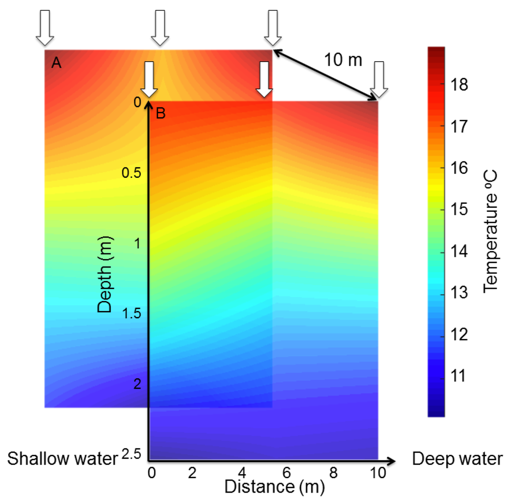 Thermal structure of a 10 × 10 × 2.5 m grid, interpolated and reconstructed from two UAS flights. White arrows indicate the UAS’s sampling locations; depth measurements were made throughout the water column at these sites.