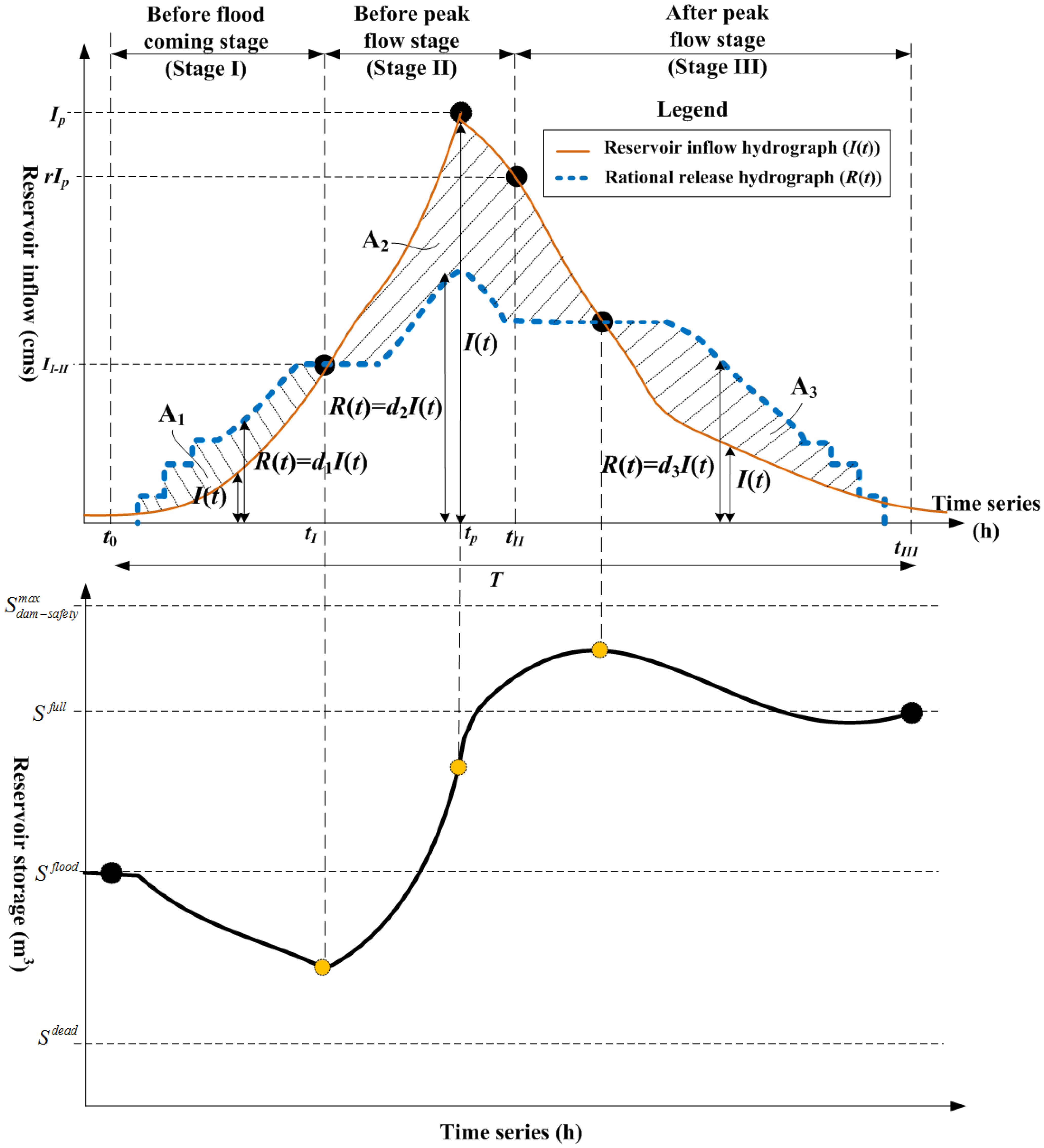 is the maximum safety storage for the dam. In order to achieve optimal operation, the storage objective for the water supply is dominated primarily by Stage III and secondarily by Stage I, and the releasing operation of Stage II is used completely for flood detention (expressed in Equation (3)) that must subject to the safety constraint (Equation (1)). Hence, we can expect that the future total inflow is the key decision information of Stage II and Stage III.