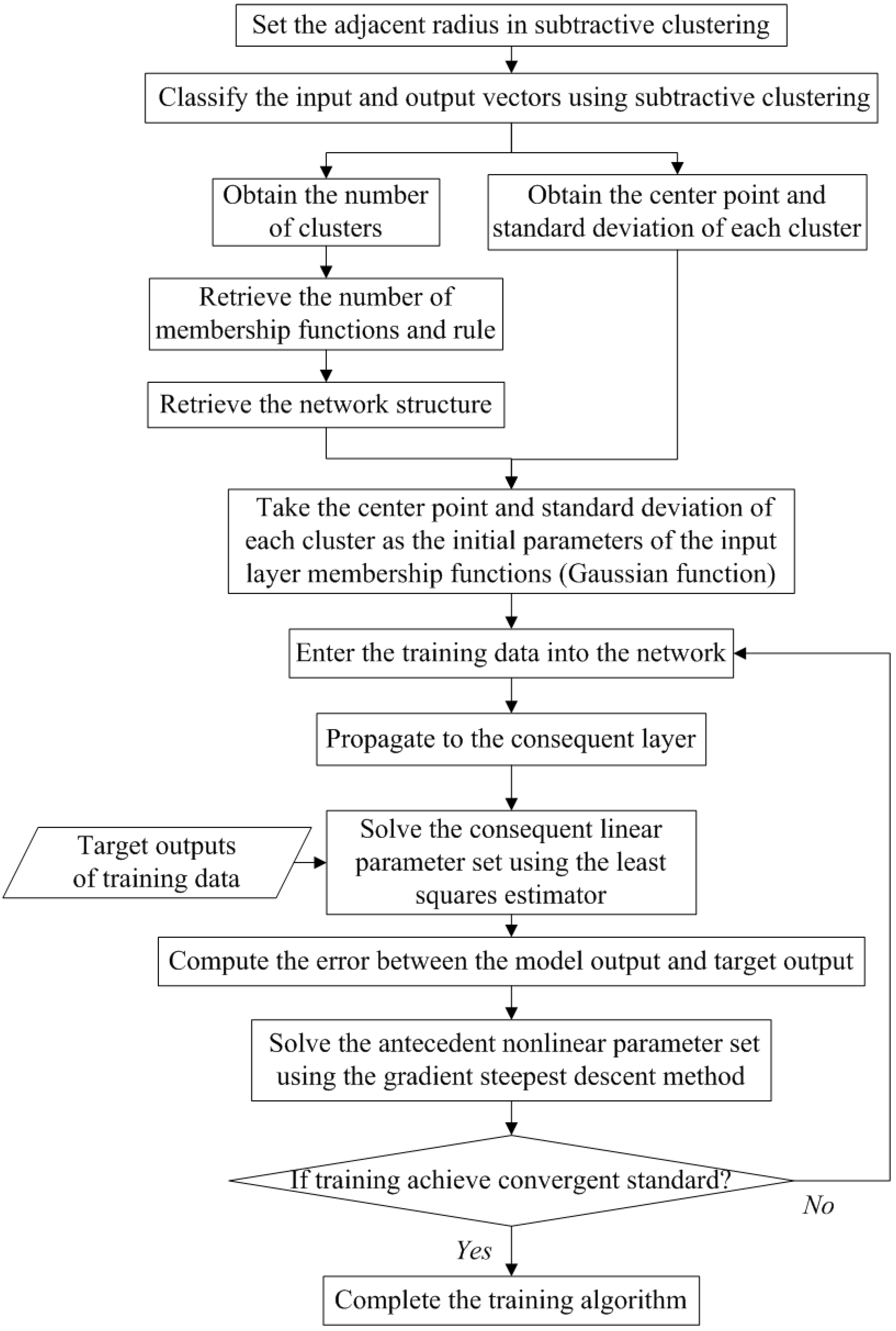rpi), and the model structure is determined by setting the number of membership functions in the input layer and the number of nodes in the rule layer. The parameters can be solved by the steepest gradient descent method and Newton’s method, for example. However, the methods would be slow and would produce a worse convergence and drop-in local optimum if the searching problem was more complex. To decrease the time for model construction in obtaining the best network structures and parameters, this study constructs ANFIS using hybrid algorithms including subtractive clustering (SC) and a least square estimator (LSE). The input and output vectors were first classified by subtractive clustering before training the model. The number of clusters obtained from the classification was set as the number of membership functions for node fuzzification at the various input layers and the number of nodes at the rule layers. After determining the network structures, the center point and standard deviation of each cluster were taken as the initial parameters of the input layer membership functions (Gaussian function). The training data were then fed into the network with the consequent linear parameter set and the antecedent nonlinear parameter set solved by the least squares estimator and the gradient steepest descent method, respectively. The corresponding algorithm flowchart of the model construction is shown in