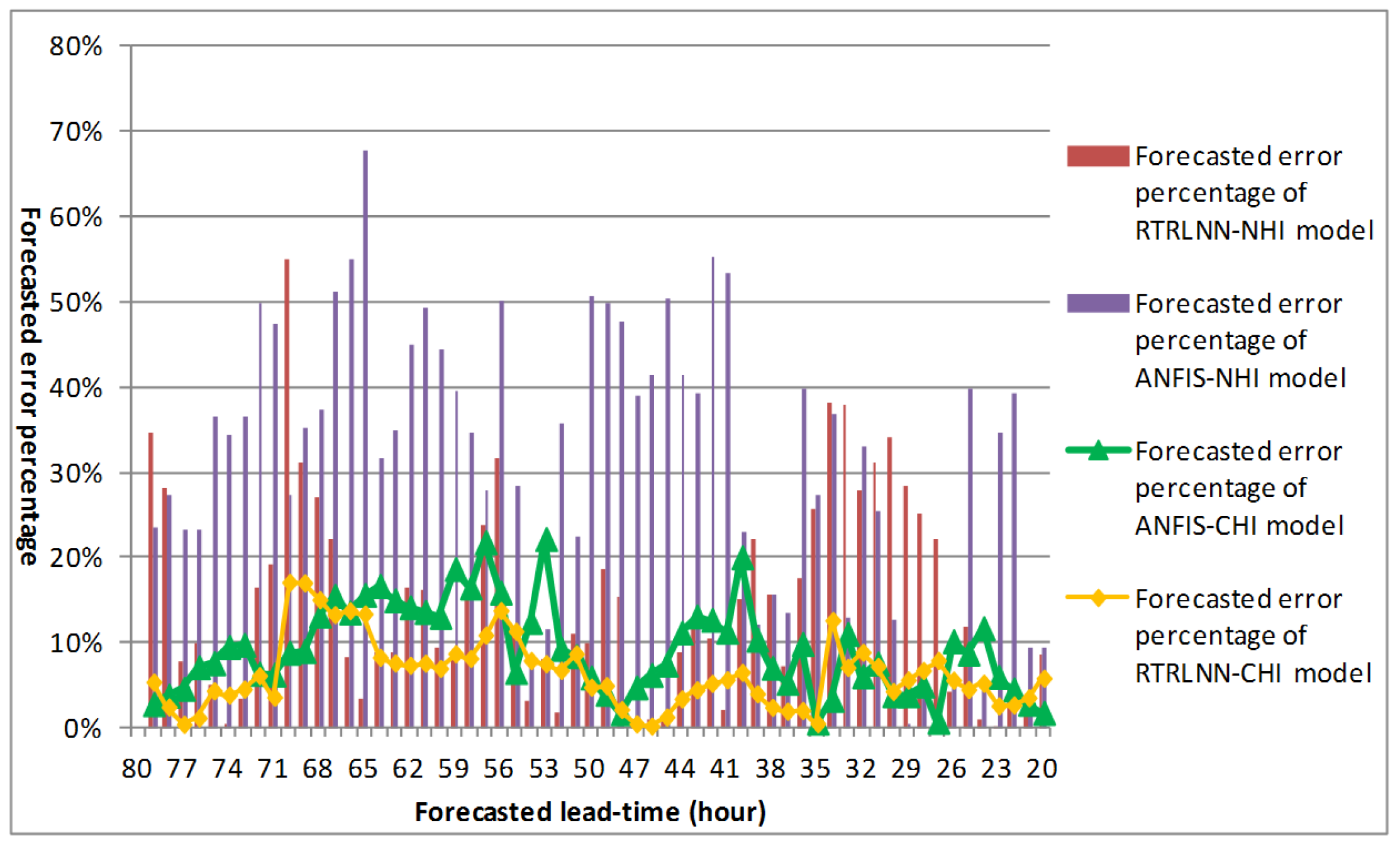 Step 2: The steepest gradient descent (SGD) and conjugate gradient algorithm (CG) were used to train the parameter of RTRLNN, and subtractive clustering (SC) with the least square estimator (LSE) were applied to train the parameter of ANFIS. On obtaining the best model by comparing the assessment index value of the individually developed model type, the forecasted outcome for the RTRLNN-CHI (Coupled Heuristic Inputs) model, RTRLNN-NHI (No Heuristic Inputs) model, ANFIS-CHI model, and ANFIS-NHI model were compared across long lead-times.