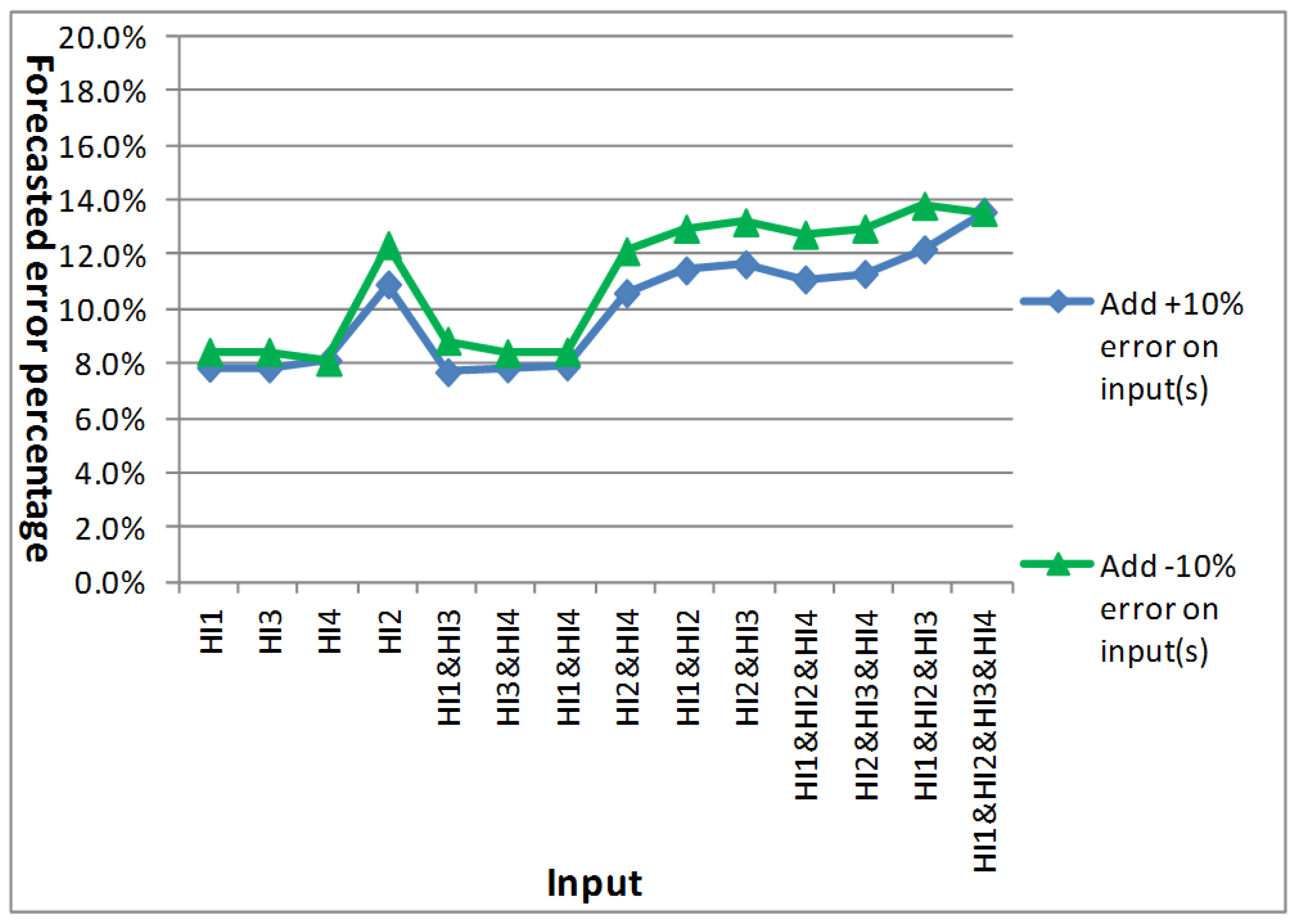 T0-EE). When such heuristic information is coupled with the input of the heuristic model, it is possible that unexpected errors will be generated on the forecast output of the model. Thus, in order to evaluate the feasibility, applicability, and accuracy of the heuristic model for real-time forecasting, sensitivity analysis was conducted on the effects on the output when forecast errors exist in the heuristic input of the most optimal heuristic model. The above analysis was used to judge whether the forecast accuracy of the heuristic model was better than that of the non-heuristic model for real-time forecasting when errors exist in the input. The expression for the analysis is as shown below: