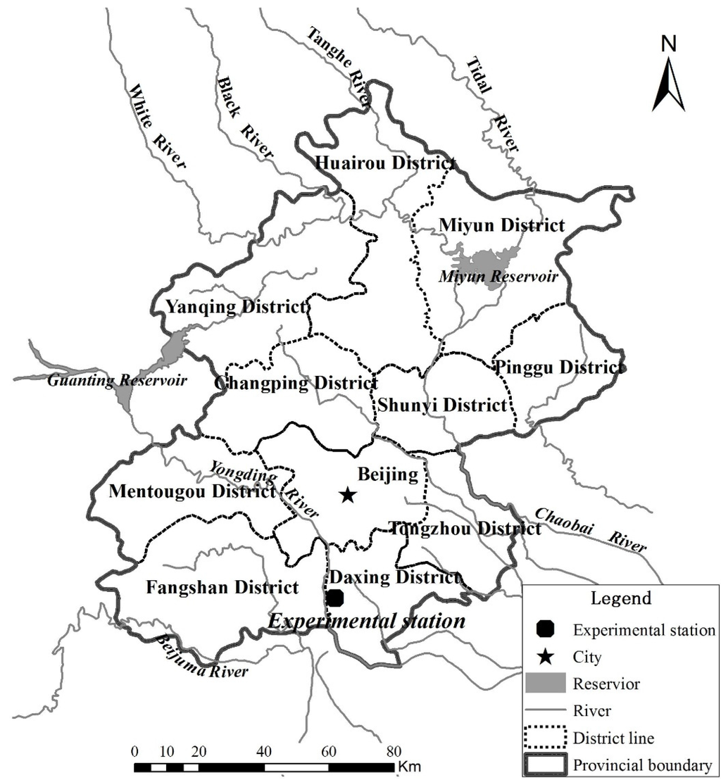 A replicated field experiment was conducted over two wheat growing seasons (2011–2012 and 2012–2013) at the Irrigation Experiment Station of the China Institute of Water Resources and Hydropower Research (39°37′ N, 116°25′ E, 30 m above sea level), which is located in the Beijing region of the NCP (Figure 1). Summer-dominant rainfall happens in this region, contributing more than 70% of yearly rainfall between July and September. The long term mean annual precipitation was 644 mm from 1951–2013, and the mean temperature was 12.2 °C. Near normal precipitation of 137 mm fell during the winter wheat-growing season (April–June) in 2012, and 98 mm fell in 2013, which was 26% less than the average of 133 mm over the last 60 years (Table 1). The precipitation in both years was significantly less than the average of 35 mm (1951–2013) in May (from stem-elongation to Development of fruit), when the crop was more sensitive to water stress [6,27]. The precipitation was also less than the average of 22 mm in April in 2013. The mean temperature over the growing season was 20.2 °C in 2012, which was 0.7 °C higher than the 19.5 °C long-term record (1951–2013), whereas the mean temperature of 18.2 °C in 2013 was 1.3 °C lower than the long-term record. The temperature was also lower in April and June of 2013 than the average maximum/minimum air temperatures of the last 60 years for the corresponding period. Mean daily 20-cm-diameter pan evaporation was 3.07 mm in 2012 (20 March–13 June) and 2.98 mm in 2013 (7 April–17 June). Full details of the experimental site and soil were provided in Wang et al. [20], and only details pertinent to this study are presented here. The soil at the experimental site was a silt loam, with organic matter content of 3.5 g·kg−1, field capacity of 0.31 m3·m−3, bulk density of 1.58 g·m−3 and permanent wilting point of 0.11 m3·m−3 (1 m depth).