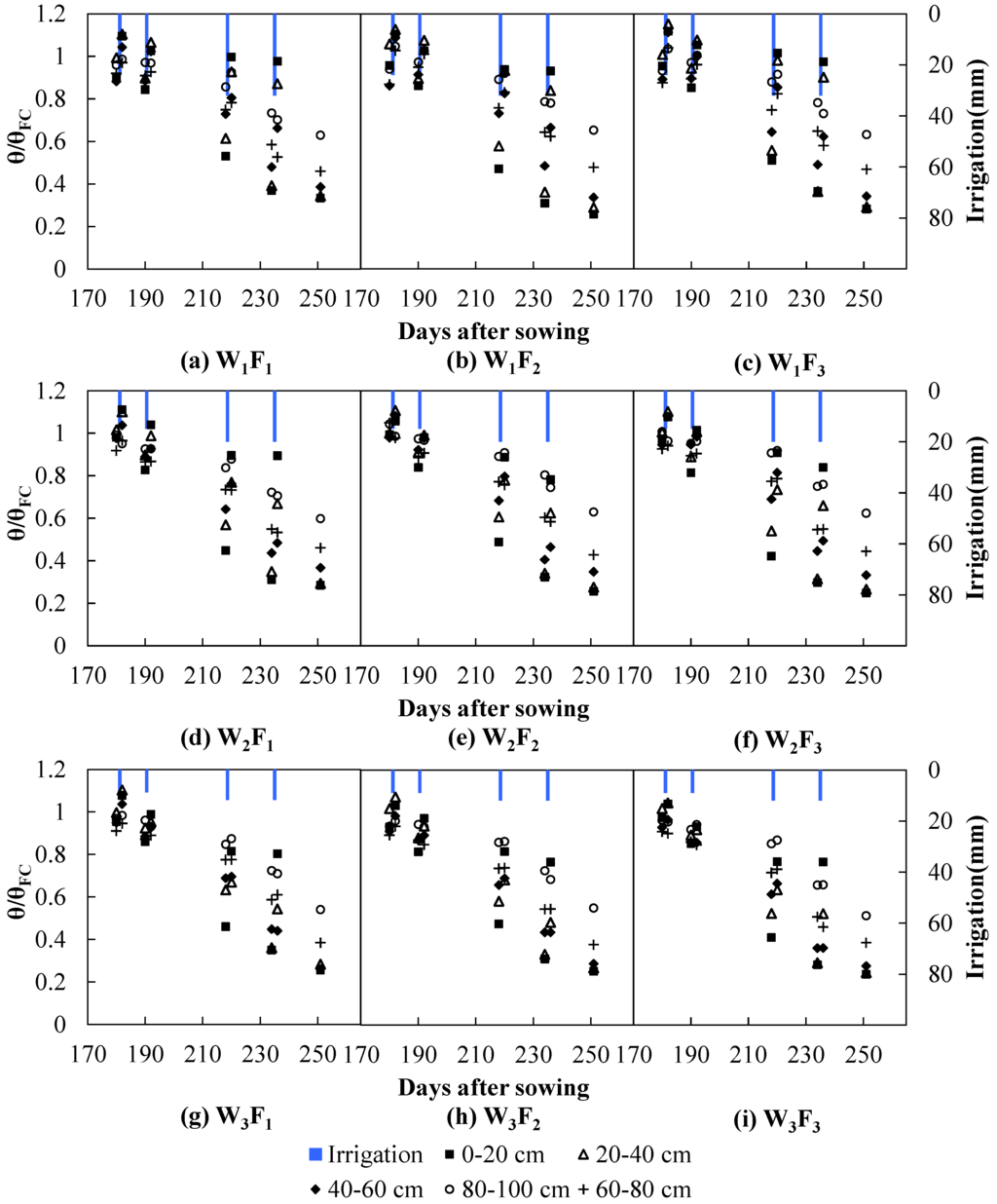 Temporal variation in relative soil moisture (θ/θFC) during the 2012 winter wheat growing season for nine treatments; W1, W2 and W3: irrigations scheduled according to 0.8, 0.5 and 0.3 cumulative evaporation of 20-cm-diameter pan (E); F1: N application at 120 kg·ha−1, F2: N application at 140 kg·ha−1 and F3: N application at 190 kg·ha−1.