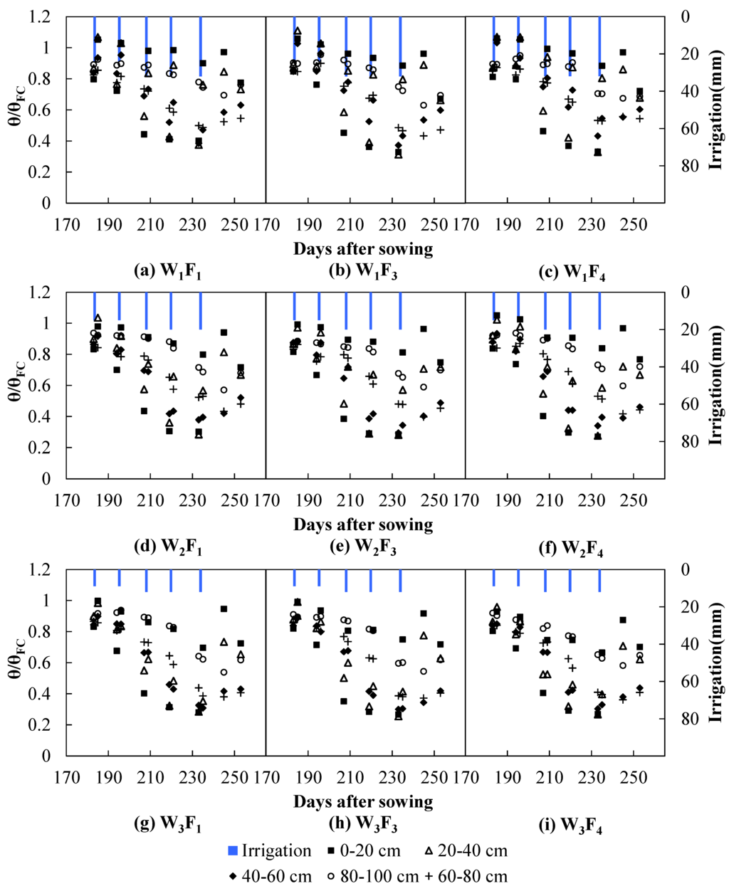 Temporal variation in relative soil moisture (θ/θFC) during the 2013 winter wheat growing season for nine treatments: W1, W2 and W3, irrigations scheduled according to 0.8, 0.5 and 0.3 cumulative evaporation of 20-cm-diameter pan (E), respectively; F1: N application at 120 kg·ha−1; F3: N application at 190 kg·ha−1; and F4: N application at 290 kg·ha−1.