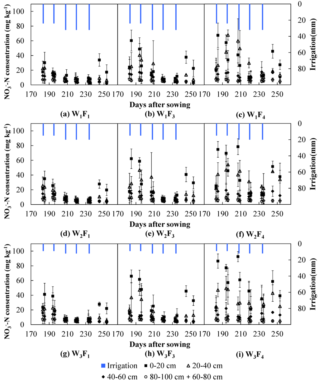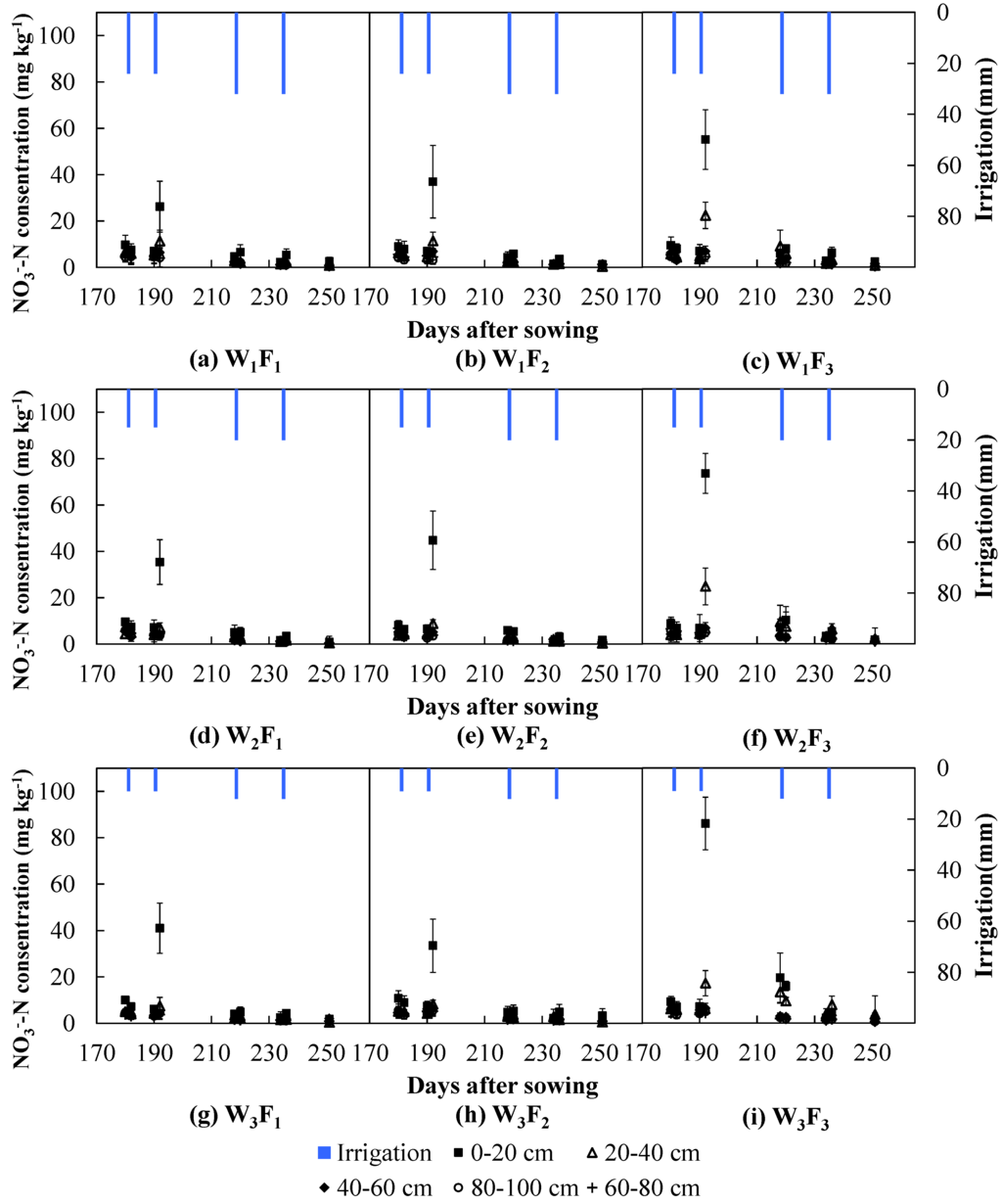 4.1. Effects of Irrigation on Water Movement and N Dynamics