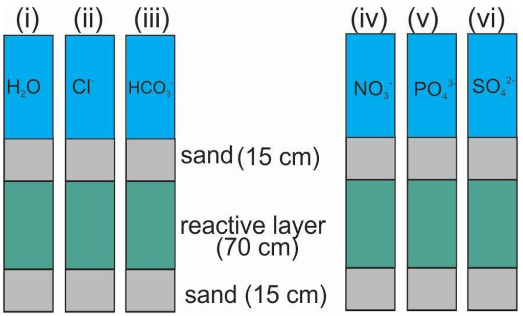 Based on the results of Fe0 efficiency characterization, a material with acceptable corrosion kinetics could be selected to test the impact of all other operational parameters. For example, testing the impact of the five named anions (Cl−, HCO3−, NO3−, PO43−, SO42−) should consist of testing six systems in parallel, the sixth system being fed by the operational solvent (e.g., tap water) (Figure 2). Ideally, relevant anion concentrations for specific sites should be tested. Alternatively, experiments with equivalent amounts of the anions uncovering the range of natural concentrations could be performed. Such principle experiments are necessary to gain a general overview of the impact of all relevant influencing parameters and, thus, ease site-specific fine-tuning experiments.
