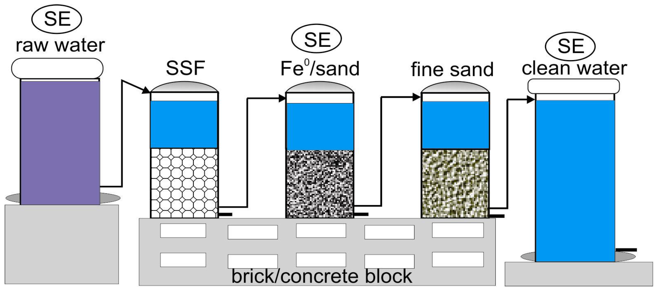 Side view of a sequential Fe0-sand water filter. To optimize the efficiency of the filtration unit, the effluent should be clarified and deaerated before being introduced, using, for example, a slow sand filter (SSF). Water from the Fe0 filter subsequently flows through a sand layer. “SE” specifies the positions where solar energy is expected to optimize operation and monitoring of Fe0 filter. SE may have four key functions: (i) pumping the “raw water” to a storage tank; (ii) regulating the flow regime out of the storage tank; (iii) controlling the temperature of the Fe0-based units; and (iv) pasteurizing the stagnant treated water. Figure is reproduced from Salama et al. [130].