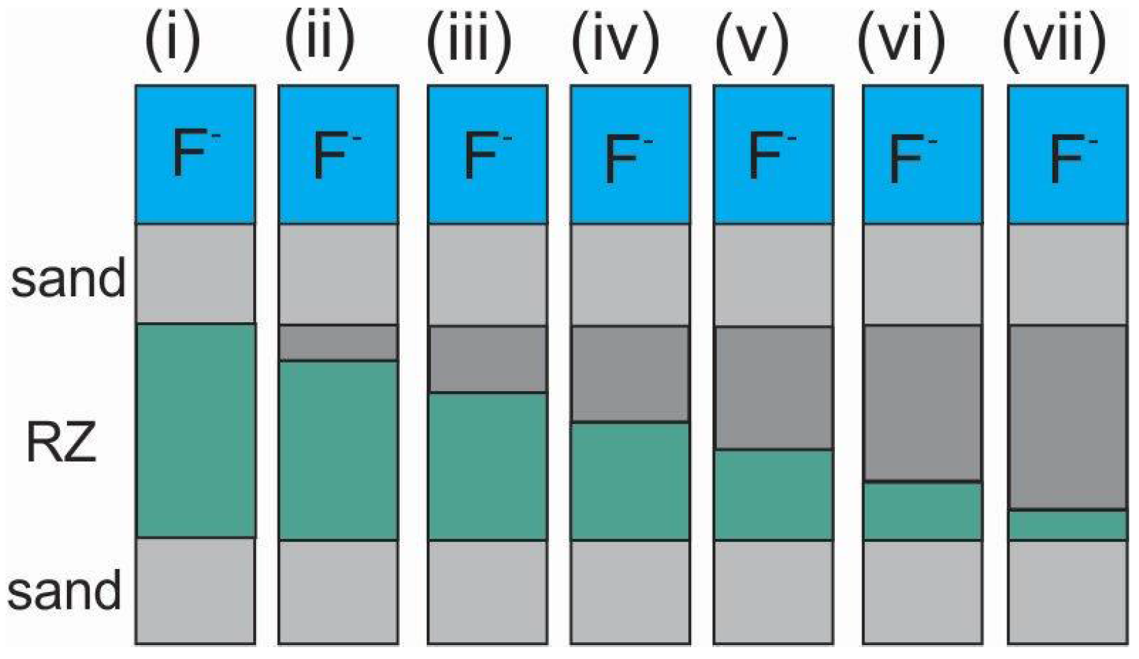 Filtration unit modules used for the investigation of the effects of the thickness of the reactive zone (RZ) on the performance of a Fe0 packed bed for F− removal. Layered arrangement of iron filings and sand used for the experiments is roughly shown. Sand in RZ is not necessarily the same at the inlet/outlet.