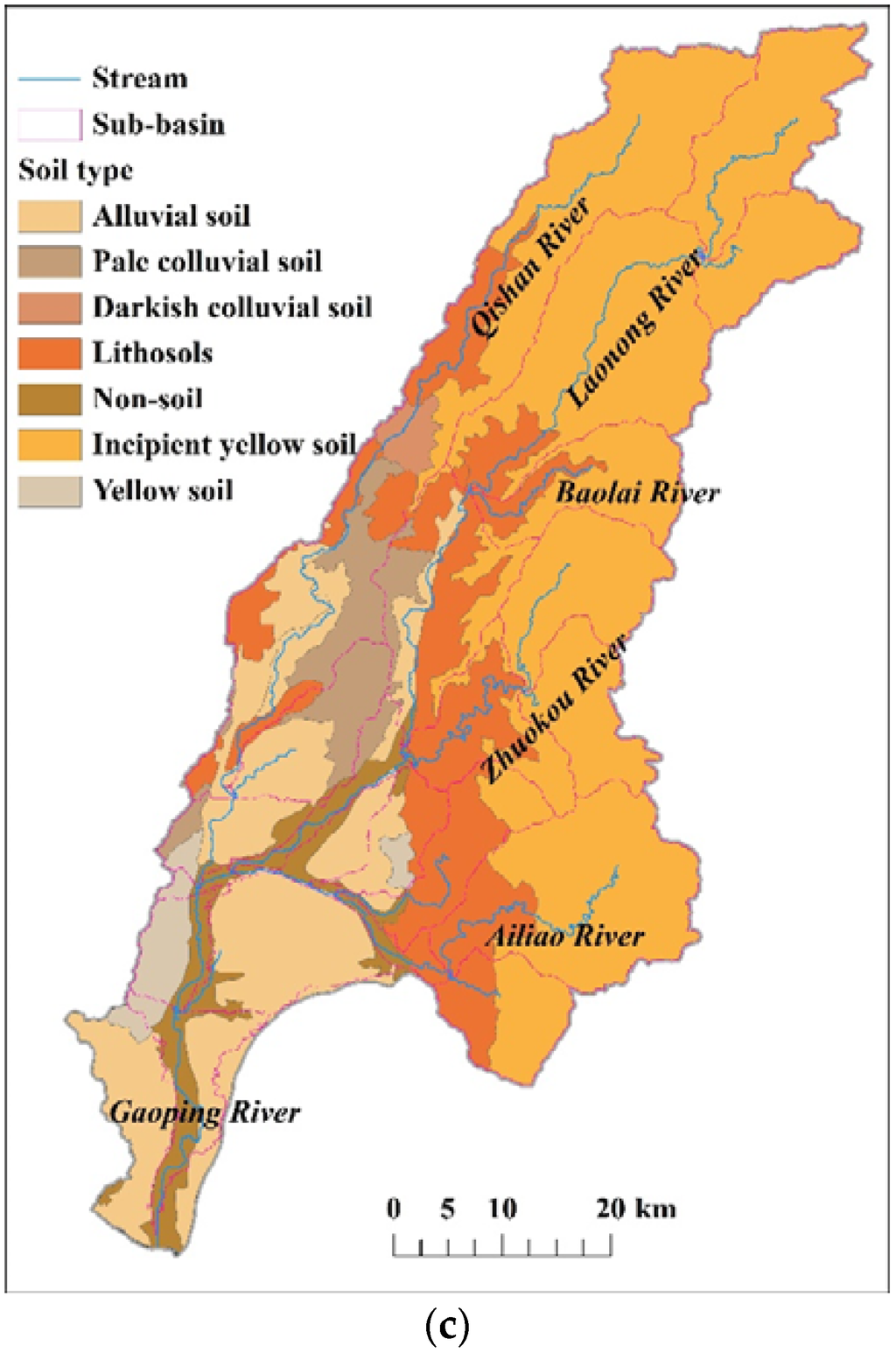 The nine main lithological units of the upper GRB (Figure 1b) consist of sandstone, shale and slate, while the lower basin consists of alluvium deposits. Under developed soil types dominate the mountainous to mid-elevation segments of the drainage area (Figure 1c), while alluvial soils form the bulk of the lower basin. The Liling Bridge gauging station is located at the confluence of the Qishan and Ailiao Rivers (Figure 1a) and collects hydrometric data (water discharge and suspended sediment) on the headwaters of the Gaoping River. The Gaoping River Dam (GRD) is located downstream of the gauge station (Figure 1a), supplying over 60% of the domestic water supply (about one million m3/d) for the City of Kaohsiung.