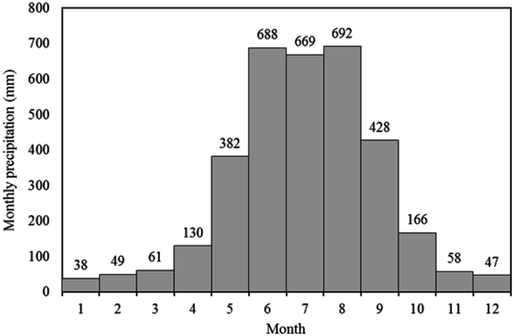 Monthly averaged precipitation of GRB during the study period (1998–2012).