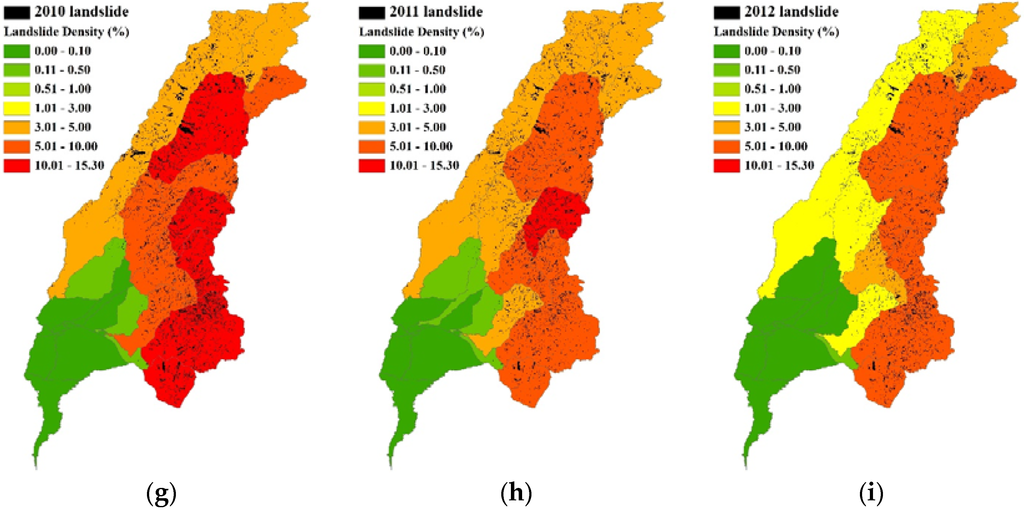 Annual landslide inventories and calculated landslide densities (total area of landslide for each sub-basin) for the catchment of GRD during (a) 2004; (b) 2005; (c) 2006; (d) 2007; (e) 2008; (f) 2009; (g) 2010; (h) 2011 and (i) 2012.