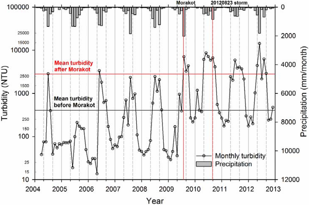 Typhoon Morakot struck the GRB on 7 August 2009, bringing 1900 mm of rainfall in three days and triggering a 5.2% increase in landslide activity. The river system responded to these disturbances with extreme sediment erosion and transport, resulting in a significant water stoppage to over two million users. After the disturbances associated with Morakot, our study found that (1) turbidity was significantly altered; (2) the correlation between event rainfall and the resulting turbidity no longer existed; and (3) the rating-curve based relationship between sediment and discharge weakened significantly after Morakot. Surprisingly, the alterations in sediment transport are non-definitive because of the low annual precipitation from 2010 to 2012.