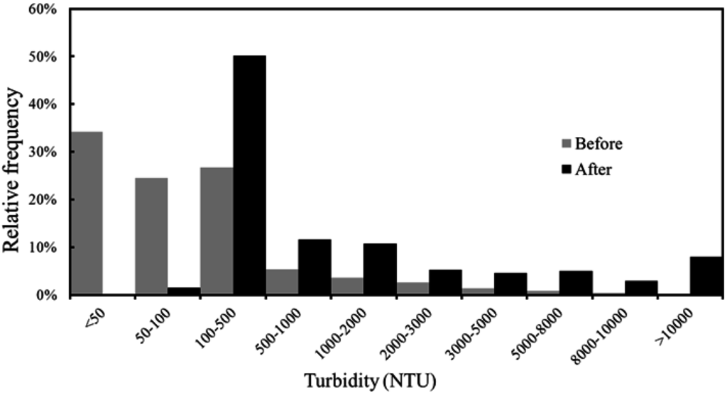 After Typhoon Morakot, turbidity in the GRD (Figure 5) increased almost by one order of magnitude during low to dry season flow conditions and became more vulnerable to subsequent mid- to wet-flow periods. This is observed during an August 2012 rainfall (639 mm), which generated Morakot-like turbidity conditions for the GRB. Under post-Morakot conditions, the probability that the turbidity (Figure 6) exceeding 3000 and 10,000 NTU increased from 3% to 21% and 0.3% to 8%. There were 66 days where the turbidity exceeded 3000 NTU and 28 days for values over 10,000, which requires partial or completely restricting the intake at water treatment facilities.