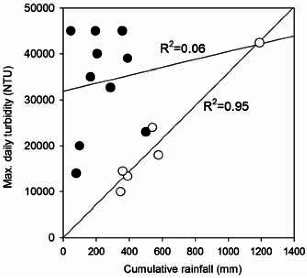 In the past (2004–2012), a total of 16 rainfall events occurred (Table 3) during which the measured maximum daily turbidity in GRD exceeded 10,000 NTU. Among those high-turbidity events, 10 are recorded after Typhoon Morakot and only two events, Fanapi and the “20120610” storm, are defined as major rainfall events (Table 4). On the other hand, four of the five events that occurred before Morakot are defined both as major rainfall and high-turbidity events. Therefore, compared to the linear relationship between maximum daily turbidity and rainfall before Morakot (R2 = 0.95, p = 0.001) (Figure 7), the maximum 24-h rainfall was no longer the most important variable explaining the occurrence of a high turbidity event (R2 = 0.06, p = 0.46). As a result, the post-Morakot basin conditions significantly increased the susceptibility to high-turbidity, indicating that now even a relatively insignificant storm can raise the turbidity.