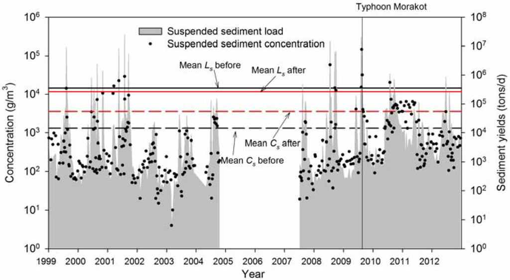 The daily river discharge (Q) and suspended sediment data from the Liling Bridge sampling location was obtained from the hydrological yearbook published by the Water Resources Agency (WRA). Suspended sediment sampling is conducted twice per month from October to June and four times per month during typhoon season (July to September) to better approximate the highly varied suspended sediment loads (Ls). On average, 30 suspended sediment concentration (Cs) are measured annually. This dataset has been widely used in previous studies [3,5,7,25]. Kao et al. (2005) [6] investigated records collected for rivers in eastern Taiwan and pointed out the poor sensitivity of the WRA measurements because more than two-thirds of the Cs values were null in the record. Therefore, the Liling Bridge dataset had 13 records with null Cs values (all collected in 1998) removed from a total of 369 measurements from 1998 to 2012.