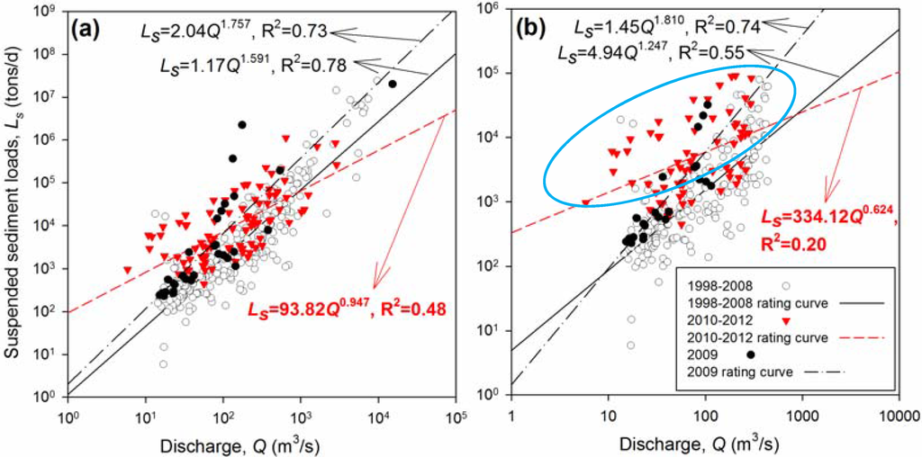 As mentioned in the previous section, we propose a postulated relationship between landslide ratio and sediment loads based on the Ls simulated by NSCE (italicized values in Table 6) and log-RMSE (highlighted values in Table 6) for the before- and post-Morakot periods, respectively. Based on this relationship (Figure 13), it is estimated that for every 1% annual increase in the landslide ratio a 2.5 Mt increase in the annual suspended sediment load will occur. This estimation is based on the landslide cover, and not on the landslide depth, which is impossible to measure from remotely sensed data.