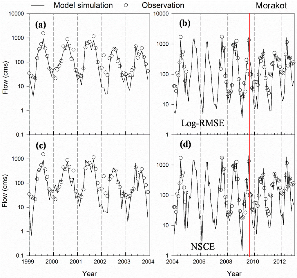The log-RMSE based flow simulation for the calibration and validation periods (Figure 10a,b) are similar to the results derived using the NSCE calibrated parameters (Figure 10c,d). The model performance evaluated by both R2 and NSCE (Table 5) indicates that with either the use of log-RMSE or NSCE as the objective function, the simulated monthly flow rates match well with the observed ones for the overall validation period, hence verifying the hydrological model used. However, for both calibration strategies, the performance of flow simulation decreased due to the overestimation of the baseline discharge after Morakot (Figure 10b,d).
