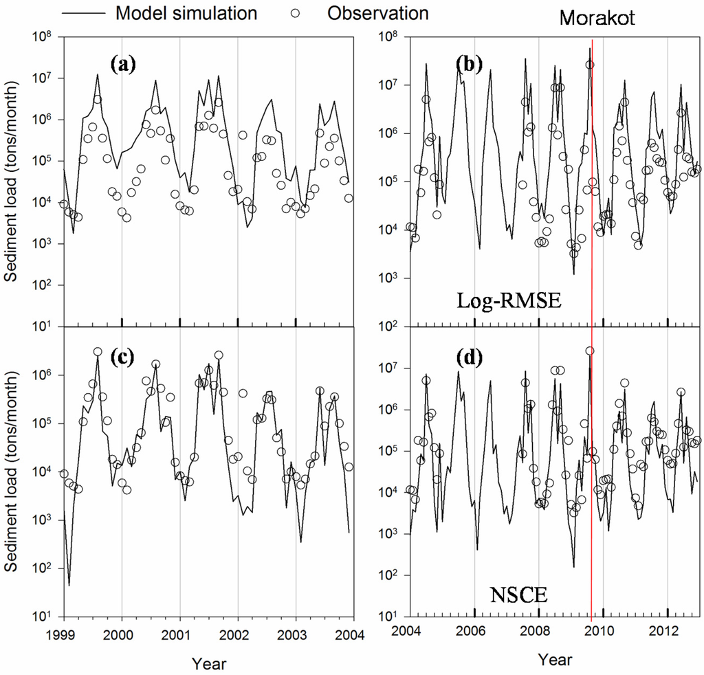 There is no straightforward relationship between the annual landslide ratio, sediment loads and precipitation (Table 6) because the annual-scale variables may be insufficient to explain the interannual variation of sediment loads [38], and the post-Morakot sediment loads are unusually low. The WRA’s flow-dependent sampling approach underestimates the post-Morakot sediment load, which is distributed over various flow regimes. This postulation of underestimation is also supported by the significant increase in turbidity observations that are continuously monitored every 5 minutes. As a result, the Log-RMSE which performs better in the turbidity simulation may provide an improved estimation of Ls.