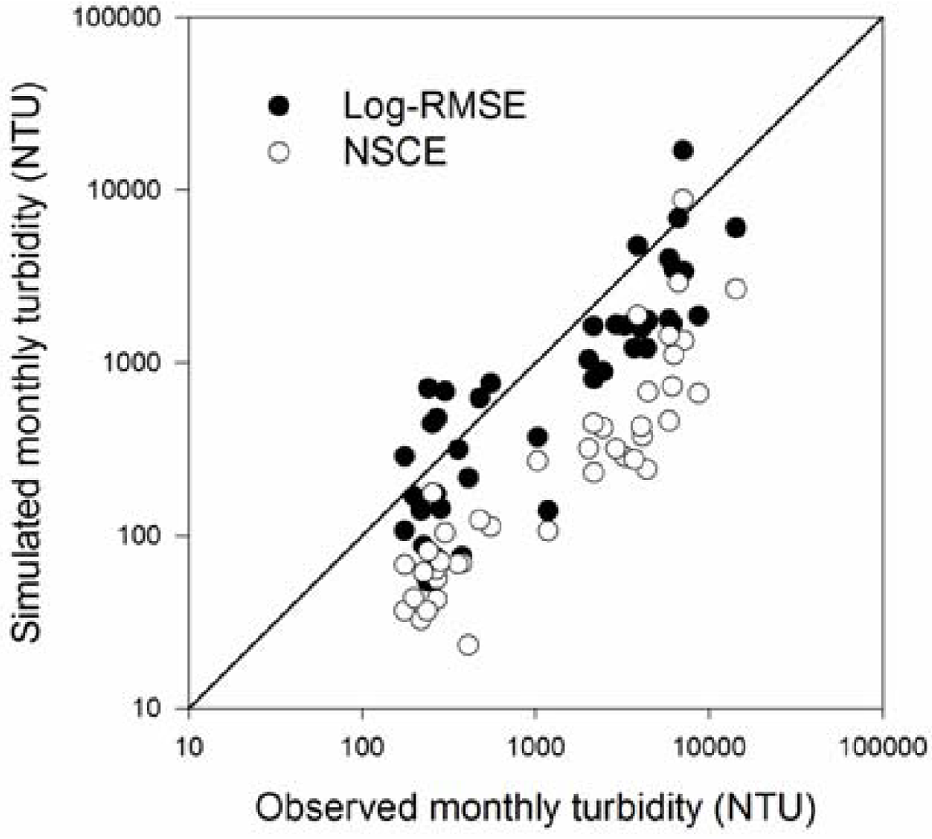 The log-RMSE gives better simulation results for the increased monthly turbidity (Figure 12) after Morakot in the measures of log-R2 (0.74), NSCE (0.05) and RMSE (2810 NTU). The severe rainfall and landslides associated with Typhoon Morakot significantly changed the characteristics of sediment erosion and transport, and a single set of SWAT model parameters cannot achieve a satisfactory prediction for both pre- and post-Morakot. Parameters calibrated by log-RMSE, which were identified by fitting the lower observed values in the calibration period and a larger SPCON and SPEXP, better explain the increased suspended sediment and turbidity baseline after Typhoon Morakot.