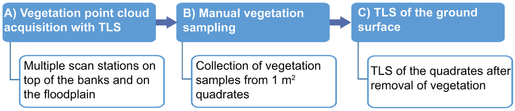 The developed approach (Figure 9) is not limited to TLS, but can be used for point clouds obtained from different LS and surveying methods depending on the data resolution. Structure-from-motion photogrammetry is a low-cost tool advantageous in generating point clouds in remote riverine environments [51]. Boat-based mobile laser scanning (BoMMS) provide centimeter resolution point data with a boat speed of 1–2 m/s [52], and the BoMMS data set can be improved with point clouds from low-altitude unmanned aerial vehicle (UAV) based photogrammetry [53]. When measurements are conducted from different angles (above, from boat or by combining them with TLS and multiple scan stations), the occlusion effects decrease. The use of multisource data is superior to sole TLS, though combining these data requires accurate relative orientation [32]. For areas of dense vegetation cover, methods that provide point clouds measured from above the vegetation, such as MLS mounted on a backpack [23] or on UAV [52], are expected to provide detailed information about the vegetation structure more efficiently than ground-based TLS.