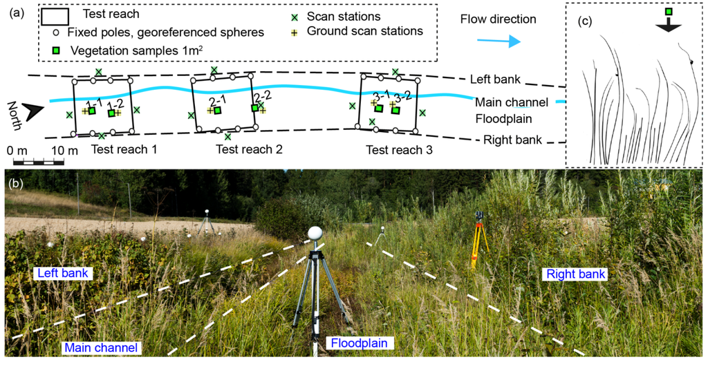 Vegetation influences flow of water in rivers and floodplains with implications on many physical, chemical, and biological processes (e.g., [1,2]). In the context of flood flow analyses, vegetation is a critical factor in determining hydraulic resistance and water levels [3,4,5]. Generally, flow-vegetation interactions affect sediment and solute transport, channel morphology, and habitat quality. In environmentally sensitive engineering practices, vegetation is used for riverbank stabilization, increasing biodiversity, and forming riparian buffer zones, where the monitoring of vegetation structure and diversity is essential for improving future practices [6]. For the monitoring and modeling of riverine environments and floodplain flows, vegetation characteristics describing the structure and distribution of vegetation are needed. Physically-based parameterization of complex natural vegetation is essential in developing reliable hydro-environmental models [3].