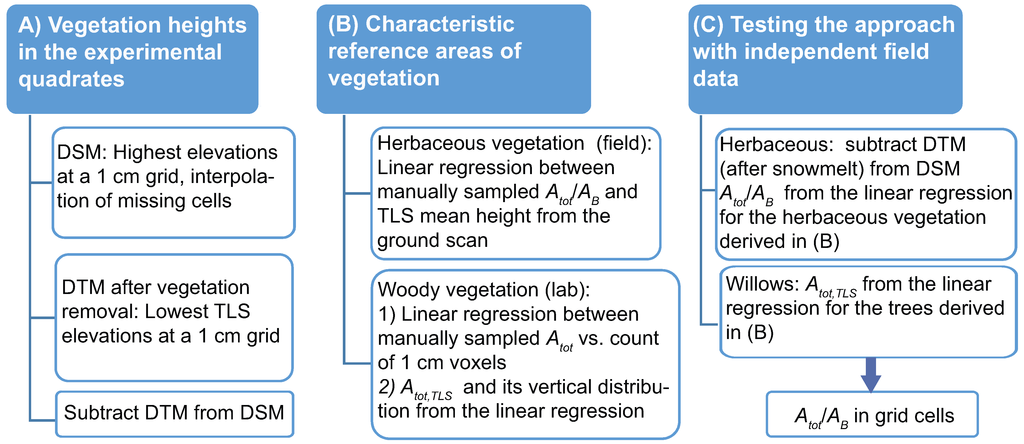 The proposed workflow to estimate the characteristic reference areas of floodplain vegetation is described in Figure 9. The high R2-values of the linear regressions suggested that the relationships between characteristic vegetation area and voxel count or vegetation height can be first derived for each vegetation type from small sub-areas, and upscaled to a reach with similar vegetation cover. The linear regressions of the herbaceous vegetation were significant, but the testing of the linear regressions (Table 2) was only indicative due to differences in the vegetation cover. During the field campaign in 2013 the monitoring of the field site [39] was finished, and the vegetation cover was more variable than the originally established test reaches [39] of the 2011 TLS data [30] used for the testing. Thus, the applicability of the sub-scale linear regressions for the upscaling (Figure 9) remains to be evaluated more thoroughly in future studies.