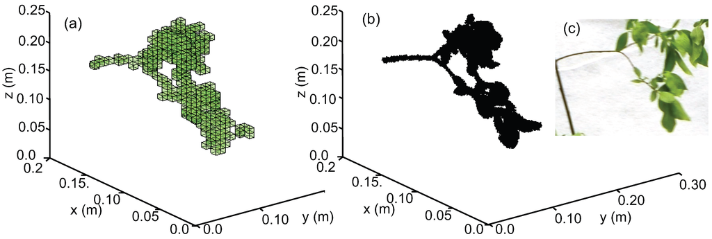 Three foliated Alnus glutinosa (Common Alder, AG) and Salix caprea (Goat Willow, SC) specimens of 1.8–3.4 m in height were laser scanned in a laboratory. The specimens were taken from a wetland area in Espoo, southern Finland in the beginning of June when vegetation had reached full foliage [11]. The LS was conducted at 3–4 m distance of the object from three directions with Leica ScanStation C10 (Leica Geosystems AG, Heerbrugg, Switzerland). The ScanStation C10 has a 360° × 270° field of view, a range up to 300 m, a scan rate up to 50,000 points/s, and 4 mm spot size (at a distance of 0–50 m). The scanning resolution was set to 5 mm at a distance of 10 m. The laser pulse follows a spherical geometry, and thus the resolution is higher closer to the scanner than at long distances. The individual scans were co-registered in Leica’s Cyclone software using spherical targets, and the segments from the scan area around the tree were manually removed from the point cloud. The co-registration error was 0–2 mm. Prior to the analyses, the incorrect points were filtered with SOR [40] (see Section 2.1). Fifty points were used for the mean distance estimation and the standard deviation multiplier threshold was one. These stray points were caused by the point size of the laser, and error points appeared e.g., from the edges of leaves.