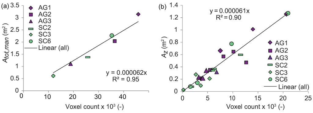 The linear fit using 1 cm voxels is shown for four vertical quartiles, Az, divided evenly over the specimen height in Figure 5b. The correlation between the vertical areas, Az, and Nvox was significant (0.95, p < 0.01) and the R2 was similar to the linear regression of the total plant area, although deviation from the mean was higher (Figure 5b). The Atot vs. Nvox values of the investigated S. caprea (SC) and A. glutinosa (AG) specimens were close to each other, and thus the linear regression was estimated for the two investigated species combined in Figure 5. This was justified, as the linear regression for the vertical quartiles with more data points (Figure 5b) showed comparable linear regression for the two species. However, it is expected that the linear regressions vary for different species due to interspecies variability in tree morphology.