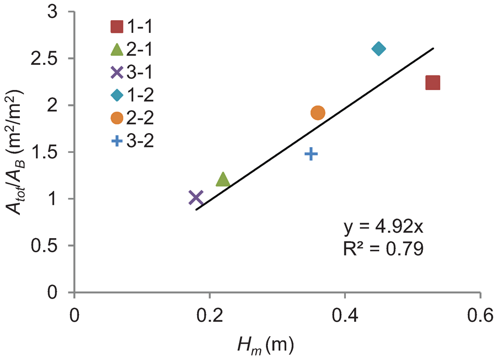 For the investigated test reaches 1–3 (Figure 2) consisting of herbaceous vegetation, a linear regression between the mean heights from 1 cm grid and Atot/AB was derived (Figure 7). The 1 cm grid resolution provided more accurate linear regression (R2 = 0.79) than the 5 cm resolution with R2 = 0.64. The 1 cm grid reflected better the structure of the herbaceous vegetation, as the 5 cm grid did not fully reproduce the variable height distribution in the quadrates and exaggerated the amount of vegetation cover. Using the 1 cm grid size, the standard deviation of the heights varied between 11 and 25 cm. Thus, a larger grid of 10 cm was found inadequate for deriving reliable results. The goodness of fit was larger for the trees in laboratory (Figure 5a) than for the herbaceous vegetation in the field site (Figure 7). The Pearson correlation was statistically significant for both but larger for the woody vegetation than for the herbaceous vegetation (0.904, p < 0.05). This was caused by the varying distances of the scanner to the sampling quadrates in the field site (Figure 2).