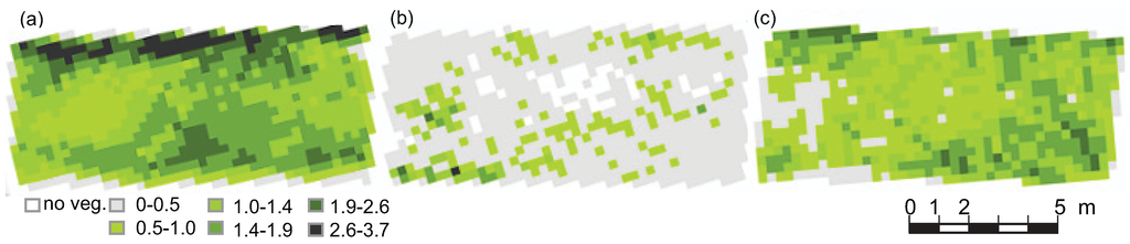 The spatial distribution of the floodplain vegetation in the test reaches is shown in Figure 8 for the 12-m-long parts of the test reaches. The scale bars show the classification of Atot/AB values in the 30 cm grid. The detected highest elevations were affected by the May DTM accuracy; hence the DTM accuracy also impacted the estimated Atot/AB. The ground level estimated from TLS depends on the vegetation height and density, incidence angle, scan resolution, location, and number of scan stations [30]. For the Grasses-U the DTM error was circa 3 cm (compared to manual cross-sectional survey, see [30]), decreasing the Atot/AB by 10%. For the Grasses-D mean error in DTM of 30 cm window size was circa 5 cm [30], and the ground level inaccuracy reduced the Atot/AB 18%. The application of the linear relationships of the Atot vs. Nvox for 5 cm and 10 cm voxels doubled the Atot/AB in comparison to using the 1 cm voxels (Atot/AB was 0.80 and 0.74 for the 5 and 10 cm voxel sizes, respectively). This can be attributed to the small size (≈1 m) of the willows in the field as the width of the willows including branches was only around 20 cm, and thus the 5 and 10 cm voxel sizes were large in comparison to the tree size.