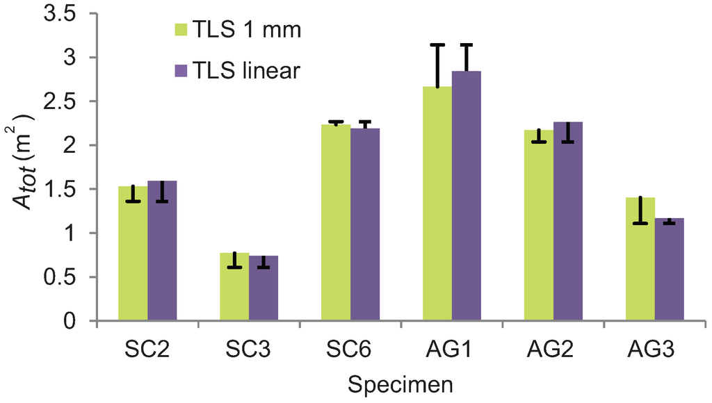 Obtaining the total plant area of a tree manually in the field is invasive and laborious. Thus, the sub-scale total plant area is more viable to estimate from high-resolution scan of the sub-area than by manual sampling. The Atot for sub-areas can be obtained by voxelizing the point cloud to a 1 mm grid [34] and estimating the Atot from the voxel count multiplied with the voxel size (Figure 10). Figure 10 shows the Atot,TLS estimated both with mm resolution TLS and with the linear regression derived in Figure 5. The bars highlight the difference to the manual measurements of Atot as Atot,man–Atot,TLS. The averaged difference of the mm resolution TLS-based Atot in comparison to the manual sampling was 10%. Note that the 1 mm voxelization method used yields twofold values of the actual stem surface area (i.e., the area exposed to the flow, see Section 2.2). To obtain the Atot, the manually measured (one-sided) AS was subtracted from the total one-sided area of the voxels (=Nvox × 1 mm2). To derive the actual AS, the stem area may also be predicted by the basal diameter (Db) [41]. The stem points can also be separated from the foliage by coloring the point cloud by the integrated camera image [21], by intensity values [45] or by selecting the stem manually in TLS software. To separate the stem from the foliage based on intensity values is difficult, as the process is sensitive to the instrument properties such as the wavelength or footprint size, and differences in the leaf spectral properties [35].