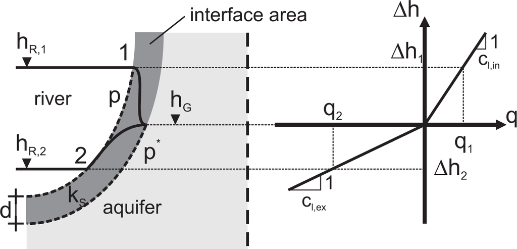 The properties of the interface layer between river and aquifer change during the flood event (see, e.g., [44]). Sedimentation of a suspended load or biogenous stabilization processes create a colmation layer on the river bed during normal or low flow conditions. A flood wave can destroy this colmation layer because of increased shear stress, and reduce the sediment layer’s thickness or even totally erode the sediment layer. In addition, the loosening of the river bed material may increase the hydraulic conductivity of the river bed, which increases the exchange of water between the river and the aquifer. With the decay of the flood event, the river bed is clogged again by sedimentation and stabilization processes and allows the leakage flux to decrease slowly [28,45–47]. Rushton [48] (Section 12.2) reports a hysteretic course of the river coefficient over river stage for the semi-arid River Yobe in northeastern Nigeria within a cycle of the hydrological year.