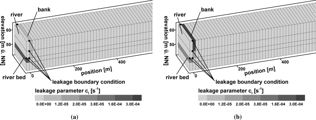 For many rivers in central Europe, water exfiltrates during normal or low flow conditions, while during high water conditions, water infiltrates into the aquifer. If Equation (4) is used both for infiltration and exfiltration, the flow resistance must be the same for both flow directions. Brunke and Gonser [27] point out that the stream bed can act like a mechanical filter. Depending on flow conditions and suspended load in the stream, colmation of the bed can reduce the infiltration rate [27–29]. In order to account for different resistance properties, different leakage coefficients are applied for infiltration (cl,in) and exfiltration (cl,ex) (see, e.g., [18,30]):