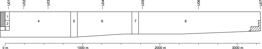 Near the village of Urmitz at Rhine kilometer 602.4 (official chainage), a chain of seven observation points has been installed [12,40]. The location of the observation points is shown in Figures 4 and 5. These observation points are not located in the area of influence of the groundwater extractions [40].