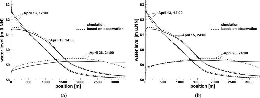 Figure 12 shows a comparison of simulated groundwater tables along the cross-sectional profile from the model with the head boundary condition (Figure 12a) and the leakage boundary condition model variant (Figure 12b) with the groundwater tables Ubell [12] derived from observations. On 13 April, the river stage reaches its maximum. On this day, the groundwater table simulated with the head boundary condition model matches quite well with the groundwater table based on observed values for the whole profile. Two and a half days later, on Day 15, however, the simulated water table lays below the one based on observed values for positions between 0 m and 1400 m. For the point in the simulation time of 26 April, 24:00 h, the match between the simulated groundwater table and the one based on observed data is even worse. Changing the hydraulic conductivity for bank elements would improve the data match for 26 April, but would also affect the water exchange during the infiltration phase. This would worsen the match between simulation results and observations for Days 13 and 15 of April, 1983. Because the leakage approach used here allows one to address the leakage parameters cl for infiltration and exfiltration independently, with the leakage boundary condition model a better match between the simulated groundwater tables and the groundwater tables derived from observed data could be achieved (Figure 12b). As shown in Section 3.3, infiltration and exfiltration follow different flow patterns, so assigning different parameter values for infiltration and exfiltration seems more appropriate for the current case.