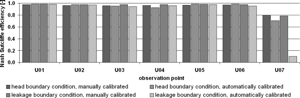 For observation points U01 to U06, a very good calibration quality for all model variants and both calibration methods has been achieved. The Nash–Sutcliffe efficiencies for observation point U07 indicates a good or acceptable match for the manually calibrated models and the automatically calibrated head boundary condition model as well; however, for the automatically calibrated leakage model, the obtained Nash–Sutcliffe efficiency of 0.103 is not sufficient. Regarding the sum of the Nash–Sutcliffe efficiencies (Table 5), the manual calibration seems to perform better than the automatic calibration; this is not surprising, as in the manual calibration more parameter zones were applied than in the automatic calibration. The manual calibrated leakage model variant gives the best calibration result in terms of Nash–Sutcliffe efficiency.