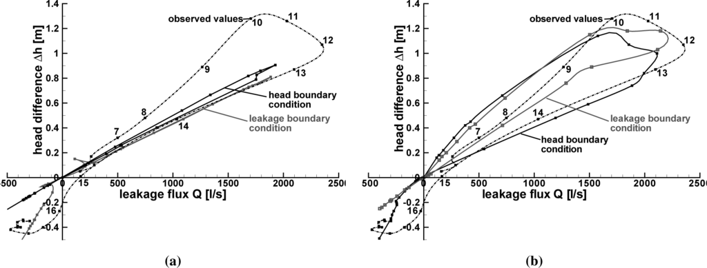 An evaluation of the Q-∆h relation with respect to the chronological sequence of the flood event is given in Figure 8. The curve has a hysteretic course: up to Day 10, the curve increases with an approximately linear course. From Day 10 to Day 11, the head difference rises only a little, while the leakage flux increases disproportionally high. On Day 12, the head difference already begins to decrease, but the leakage flux continues to rise. Therefore, a limitation of the leakage flux for large head differences ∆h, as given with Equation (9), seems less appropriate than a leakage function that returns disproportionally high values for large head differences, like the wetted perimeter approach.