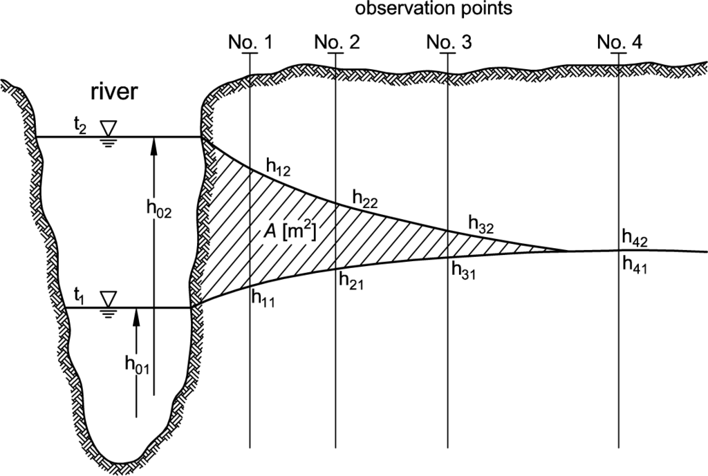 Ubell [12] derives the leakage flux from observation wells that are installed in a line orthogonal to the river (see Figure 15). From the change in groundwater level, he concludes the volume change in the aquifer. Figure 15 shows the initial situation at time t1, where the river stage is h01, and the groundwater level for the observation points is given by h11 to h41. At t2, the increased water level in the river causes water infiltration into the aquifer. The groundwater level rises to h12, h22 and h32, while for observation point 4, the water level does not change. The groundwater storage between t1 and t2 is given by the area A. The change in water volume V′ can be calculated by: