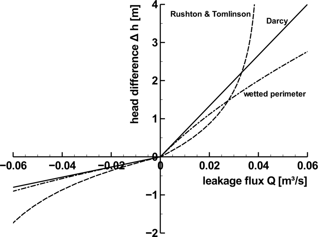 With Equation (7), the Darcy approach describes a linear relationship between Q and ∆h if the interface area is assumed to be constant. The leakage function becomes nonlinear if the interface area A is calculated in dependence of the wetted perimeter of the river bed p (m) (see Figure 1), as proposed by Pinder and Sauer [10], Cunningham and Sinclair [21], Panday and Huyakorn [31], Krom and Graham [32] and Rushton [26]: