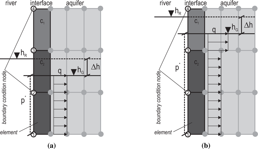 The boundary condition causes a withdrawal or an allocation of water at the boundary node according to the applied boundary condition value. The exchange flux also depends on the groundwater flow situation in the vicinity of the boundary condition node. Freeze [20] limits the applicability of head-boundary conditions to shallow rivers with non-varying depths and where steep groundwater gradients and large leakage areas are existent. For subsurface floods, these conditions will not apply in general. Cunningham and Sinclair [21] recommend head-boundary conditions for rivers that are fully penetrating the aquifer. This condition will apply to many of the large rivers where subsurface floods occur. Ubell [22] uses a head boundary condition in his modeling study. Modeling bank storage with a head boundary condition does not necessarily rely on the assumption of an interface layer between river and aquifer. If there is no interface, hR is the river stage. If a sediment layer separates the river and aquifer, the sediment layer must be modeled directly, i.e., with elements that comprise the hydraulic conductivity properties of the interface layer, or hR represents the groundwater level on the aquifer side of the interface layer. Boundary condition data for the latter case can be obtained by pre-model calculation.