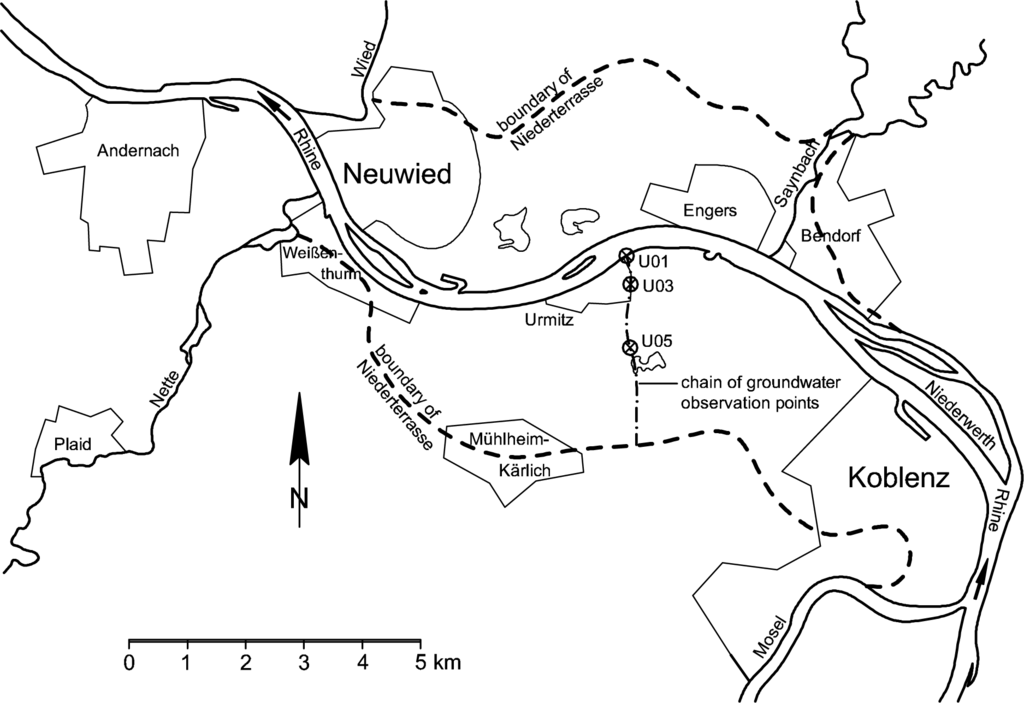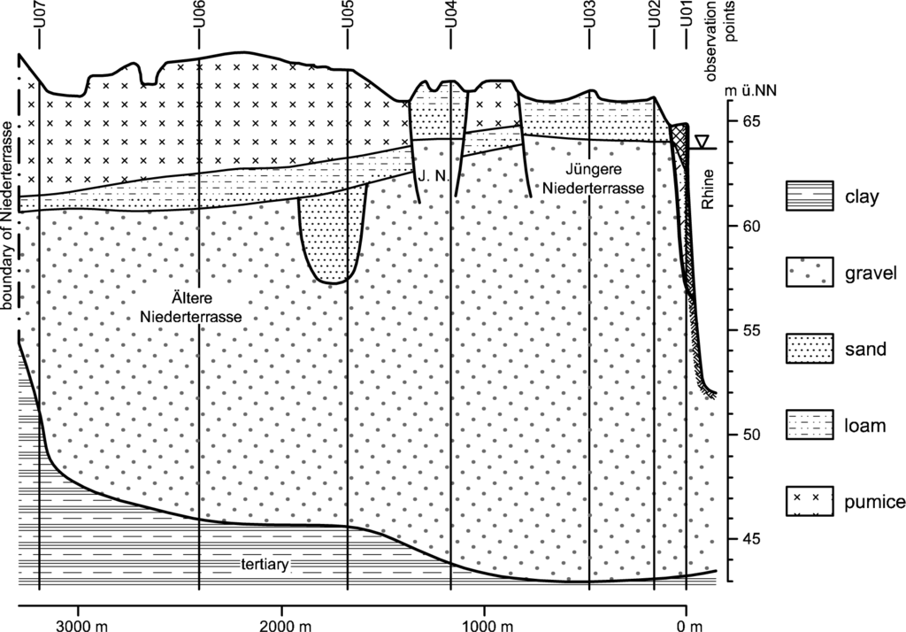 With a length of 1232 km, the Rhine is one of the largest European rivers. At the gauge in Emmerich, the average discharge is 2330 m3/s, and the Rhine is 730 m wide here [37]. The Neuwieder Becken is a broad valley at the Rhine located between the cities of Koblenz and Andernach (see Figure 4). Here, the Rhine is about 400 m wide. The Neuwieder Becken covers an area of 7 km in width and 15 km in length and is a result of tectonic settlement within the “Rheinisches Schiefergebirge”. Sedimentary and erosion processes generated several terraces (the two large ones are the Ältere Niederterrasse and the Jüngere Niederterrasse). This results in a localized groundwater system with minimal interaction with other groundwater systems [38]. Above the tertiary aquifer base of hard rock [12], there is a thick gravel aquifer with a high permeable material that is covered with layers of sand and sandy loam. Loose pumice stones originating from the Laacher See volcano [39] can also be found. In Figure 5, a cross-sectional hydrogeological profile is given.
