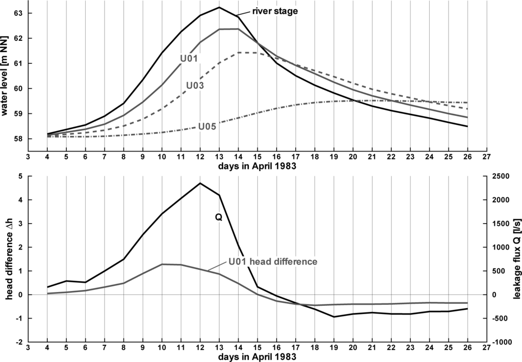 In order to derive a leakage function for the flood event in April, 1983, head differences between the river stage and the groundwater level observed at observation point U01 have been calculated (Figure 6, bottom). Observation point U01 has been chosen, because this observation well is located directly at the bank and, thus, is the most feasible of all observation wells according to the leakage approach conceptual model, where the head difference ∆h is defined between both sides of the assumed interface layer. The head difference values mainly comprise two sources of inaccuracy: firstly, the river stage used for the head difference has been measured at a different location and has been transferred to the chain of observation points [12]. Secondly, the groundwater level is related to an observation well that does not necessarily represent the edge of the interface layer. If there is a distance between the aquifer side of the interface layer and the location the head difference ∆h is computed, the groundwater level hG reacts to the leakage flux q with delay (see [43]) and not directly. However, as observation point U01 is located at the river bank, we assume this effect to be small.