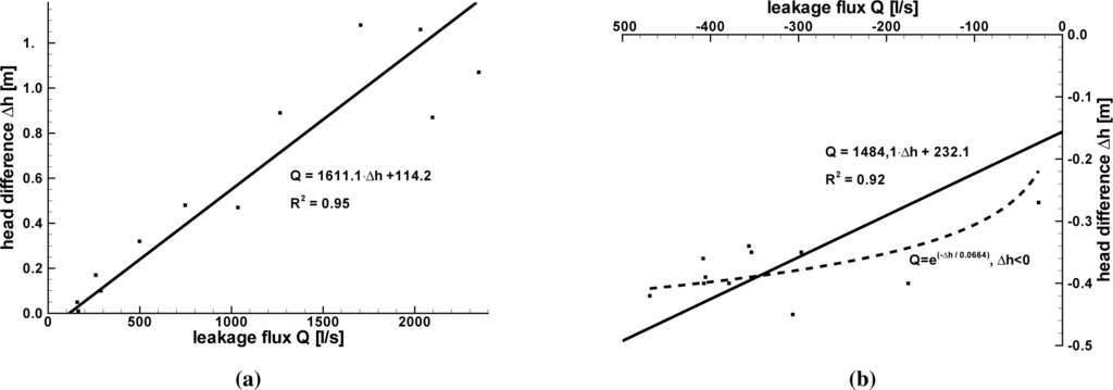 For the exfiltration process, the slope of the regression line is slightly lower than the slope of the regression line for the infiltration process. The axis intercept is larger than in the case of infiltration, while the coefficient of determination R2 calculated for exfiltration is smaller than it is in the case of infiltration. An exponential function appears to match better with the observed data. However, the interpretation that the leakage flux is independent of the head difference seems also to be suitable here. In this case, the leakage model would not be appropriate to describe the interchange process. As mentioned in Section 2.3.2, it is often assumed that the leakage flux for a certain head difference is smaller for infiltration than for exfiltration, due to a river bed colmation (see, e.g., [27]). The leakage function presented here does not support this assumption for the current case.
