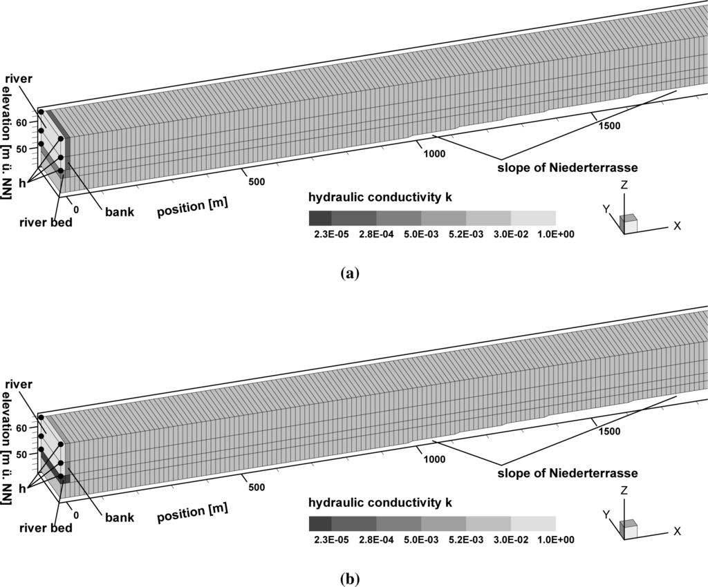 In the head boundary condition model variant, we set the river stage at the nodes that represent the river itself, while for the leakage boundary condition variant, we applied the boundary condition on those nodes that represent the surface of the interface area. Following Ubell [22], on the right boundary (the Niederterrassenrand), a no flow boundary condition is set, and neither groundwater recharge nor leakage from the aquifer base are considered in the model.