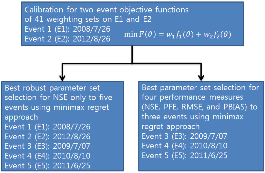 Two different approaches are proposed to select the ROPS in this study. One assesses the NSEs with calibration and evaluation sets of events (Section 3.2.1) and the other assesses the multiple performance measures, i.e., NSE, PFE, RMSE, and PBIAS with evaluation sets only (Section 3.2.2).