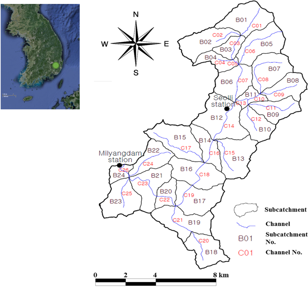 The proposed approach was applied to the parameter selection problem of the SWMM using five rainfall-runoff events in the Milyang Dam basin of South Korea (Figure 2). The Milyang Dam basin includes an area of 95.40 km2. The study area is located in a mountainous region with the elevation ranging from 130 to 1180 m. As shown in Figure 2, the Milyang Dam is located in the outlet of the study basin with water flowing from the northeast to southwest of the basin. The basin was divided into 24 sub-basins, and the river channels were divided into the 26 sub-channels for the SWMM. The rainfall data from two telemetry (TM) stations at the Milyang Dam and Seoli were used.
