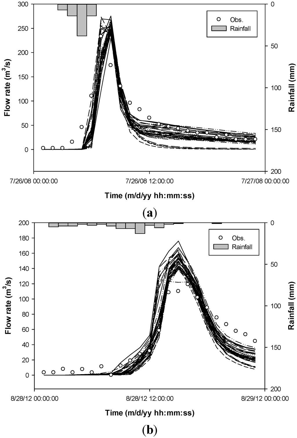 The five events were divided into two different sets: two events for calibration and three events for evaluation only, as shown in Table 1. We have subjectively selected one event per year during the rainy season of 2008–2012. In Korea, the most of heavy rainfall events take place during the summer monsoon (mostly in June, July and August) and therefore the flood events are observed during those months. While the selection process of rainfall events might be arbitrary, we have taken an effort to utilize various types of rainfall events in the study. The two events selected for calibration have a similar total precipitation but totally different temporal patterns, which resulted in the different peak flows. That is, E1 had a very high maximum rainfall intensity while E2 had a relatively uniform rainfall intensity. Additionally, three events for the model performance validation were selected that represent the years 2009, 2010, and 2011, respectively. E3 and E4 have spatially homogeneous rainfall because the total precipitation of the Milyang dam and Seolli stations had similar values, and E3 and E5 had a very uniform rainfall distribution because their maximum precipitation rates were under 12 mm/h.