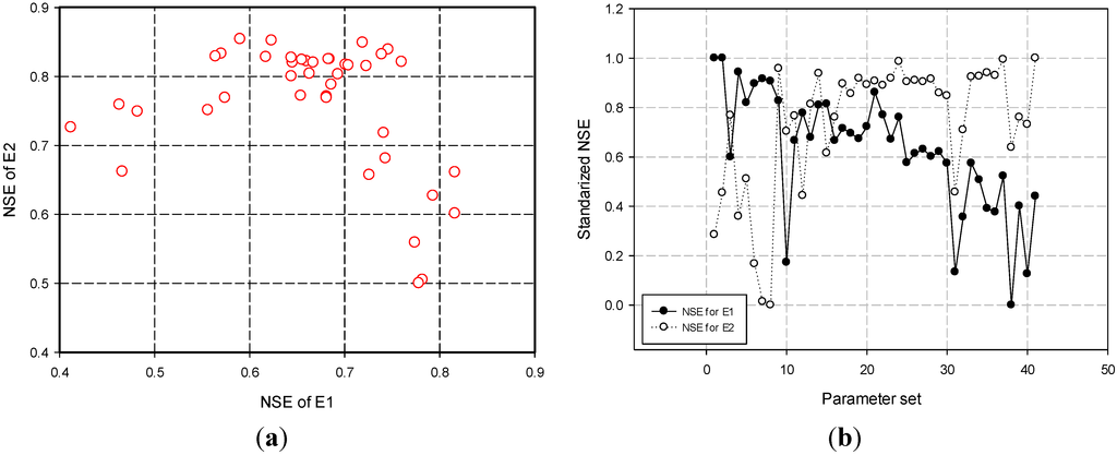 NSEs for E1 and E2 with 41 parameter sets: (a) scatter plot between two NSEs (i.e., Pareto optimal sets) and (b) standardized NSEs along the 41 parameter sets.