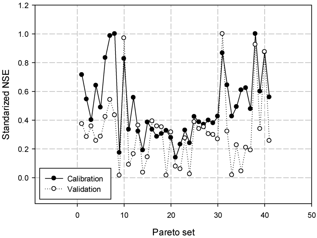 The performance of the model can be evaluated using different performance measures that can quantify the goodness of fit between the simulated and observed data. For hydrological rainfall-runoff models, the critical performance measures include the runoff volume, shape of hydrograph, peak, and low-flow timing, rate, and volume [8]. To solve multi-objective functions that include multiple performance measures, calibration techniques have evolved together with advances in computational power. However, as the number of objective functions that are included in the calibration has increased, the number of exact or near-Pareto-optimal parameter sets has also increased, and thus, calibration has evolved into a decision-making problem for selecting a set of suitable model parameters from a number of Pareto sets [2].