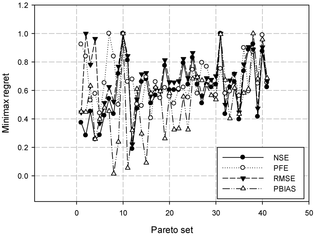 Finally, the ROPS framework using the MRA can be a more useful way to determine the best among many optimized sets when considering many performance measures and multiple events. Note that this study does not focus on which selection approaches perform better than the other, rather it proposes two possible ROPS selection procedures, focusing on different aspects of the parameter selection problems (multiple events or multiple performance measures). Any approach can be used depending on the available data or personal preferences. That is, they can use one (NSE or others) or more for the selection process and then proceed to derive ROPS based on the framework proposed in this study.
